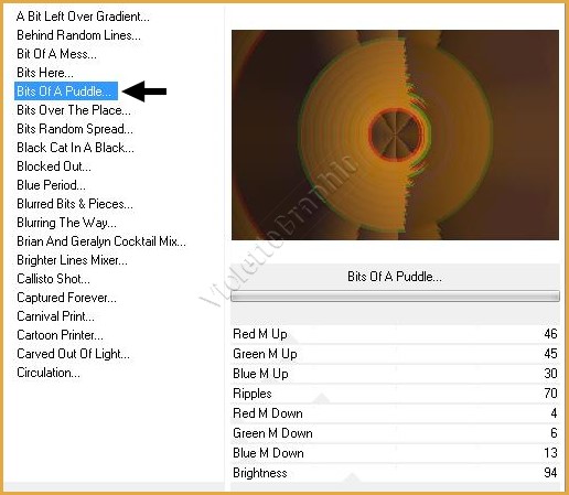 Andrew's Filter Collection 56 / Bits Of A Puddle réglages suivants : 46 / 45 / 30 / 70 / 4 / 6 / 13 / 94