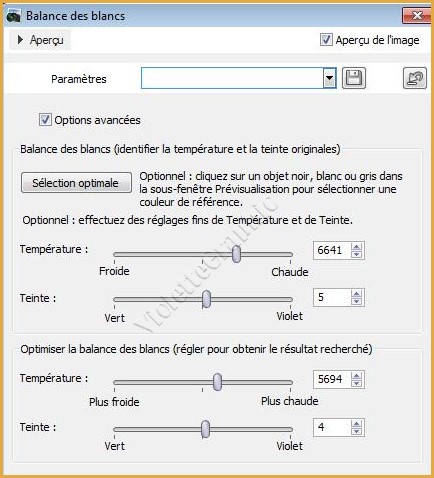 18 - Réglages/Balance des blancs réglages suivants : Pour les versions antérieures/Equilibre des couleurs : 5003 / 6 / 4372 /0