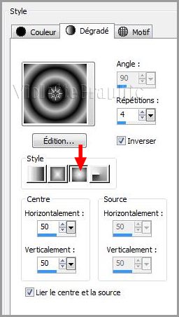1 - Remplir de dégradé formé des couleurs :premier-plan couleur #040303/ arrière-plan couleur #c0c0c0 configuré : halo/angle: 0°/Répétitions : 4/inverser coché