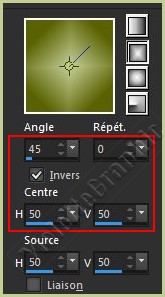 4 - Calques/Nouveau calque ( Calque 2 )** Dans la Palette de StyleConfigurer un dégradé rectangulaire/ angle: 45°/Répétition: 0/Inverser coché