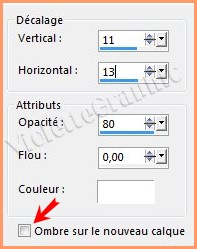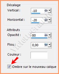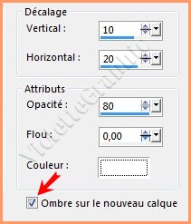 12 - Activer le calque supérieur Effets/Effets 3D/Ombre Portée : -10/-20/80/0/couleur #ffffffcase ombre sur le nouveau calque cochée