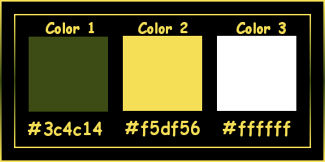 1 - Ouvrir les tubes , les dupliquer et fermer les originaux **Placer en premier-plan la couleur #3c4c14 et en arrière-plan la couleur #f5df56 Palette de couleurs utilisée :