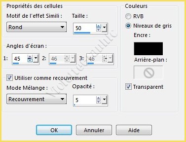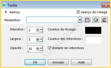 **Remplir la sélection de dégradé **Effets/Effets de Textures/Textile réglages suivants : 1/5/10/ couleur #000000 **Sélection/Transformer la sélection en calque Mode de fusion: Eclaircir