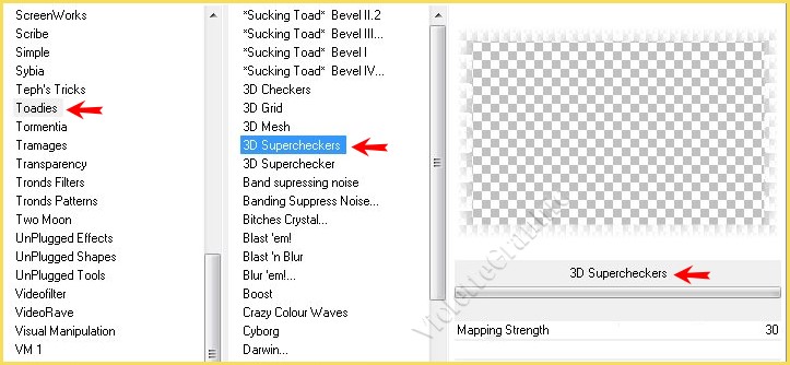 **Sur le calque dupliqué **Effets/Toadies / 3D Supercheckers réglages suivants : Mode de fusion: Recouvrement Garder la sélection 6 - Activer le calque 2 Effets/Effets de Textures/Textile réglages suivants : 2/5/10/ couleur #000000
