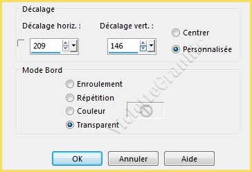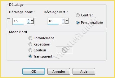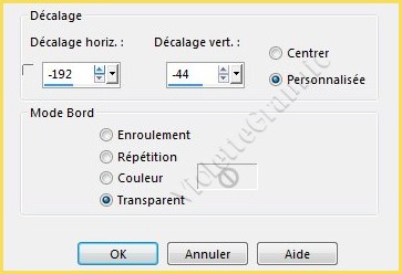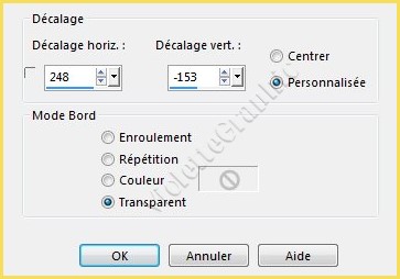 **Effets/Effets d'image/Décalage réglages suivants : 12 - Activer le calque 3 **Calques/Réorganiser/Placer en haut de la pile **Activer le tube "Mina@bimbo.pulcino.04.15.pspimage Supprimer le filigrane Edition/Copier/Edition/Coller comme nouveau calque Image/Redimensionner à 70%/décocher " Redimensionner tous les calques" **Effets/Effets d'image/Décalage réglages suivants :