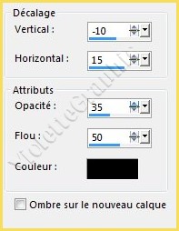 Réglages/Netteté/Netteté 13 - Effets/Effets 3D/Ombre Portée : -10/15/35/50/couleur #00000014 - Activer le tube calguiseaster7310.pspimage Supprimer le filigrane Edition/Copier/Edition/Coller comme nouveau calque Image/Redimensionner à 70%/décocher " Redimensionner tous les calques" **Effets/Effets d'image/Décalage réglages suivants :
