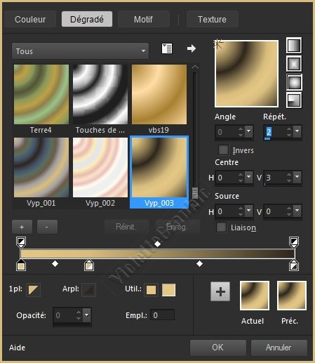 Dans la Palette de Style Placer le dégradé Vyp_003.pspgradient Configurer dégradé halo/angle: 0°/Répétition: 2