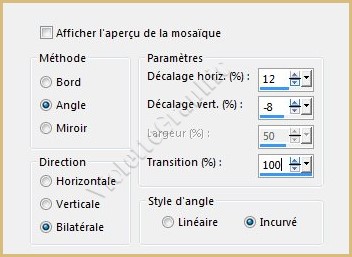 2 - Effets/Effets d'image/Mosaïque sans jointure réglages suivants: