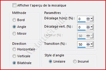 18 - Ouvrez le tube deco_vibrante_03.pspimage 19 - Edition/Copier/Edition/Coller comme nouveau calque 20 - Effets/Effets d'image/Mosaïque sans jointure réglages suivants :