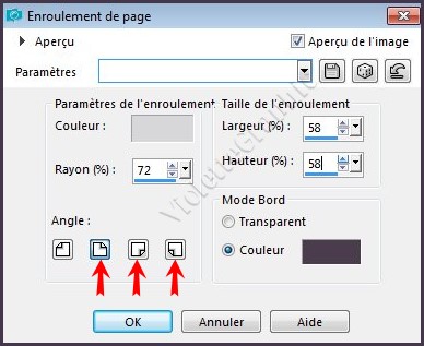 4 - Images/Effet d'images/Enroulement de page réglages suivants : couleur #d7d7d9/couleur #4b3d4d Faire cet effet sur les coins 2/3 et 4 avec les mêmes réglages
