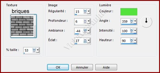 12 - Effets/Effets de Textures/Texture réglages suivants : Couleur #54e33c