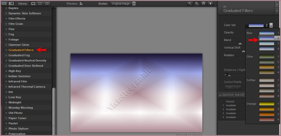 18 - Activer le calque 1 **Effets/Nick Software /Color Effex Pro 3.0 Complete réglages suivants : Graduated Filters/ Set Blue n° 2