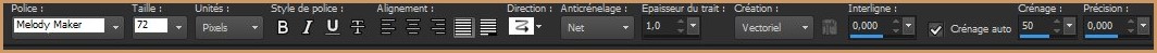 26 - Activer l'outil Texte/Police Melody/taille : 72/vectoriel/crénage 50 premier-plan fermé /couleur arrière-plan #a8a19c