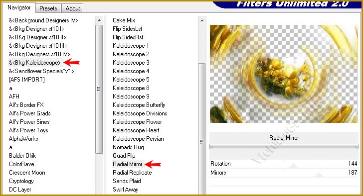 9 - Effets/Unlimited/ Kaleidoscop/Radial Mirror réglages suivants :