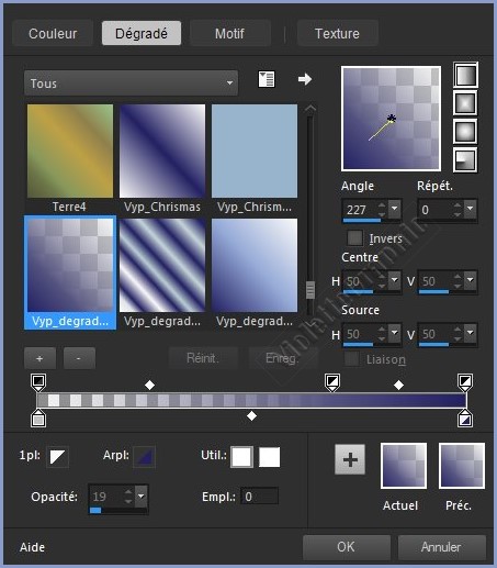 **Dans la Palette de Style Configurer un dégradé linéaire Vyp_degrade_Audrin.PspGradient /angle: 227°/Répétition: 0/Inverser non coché