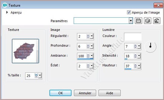 11 - Effets/Effets de texture/texture réglages suivants: Appliquer la texture: texture.gif
