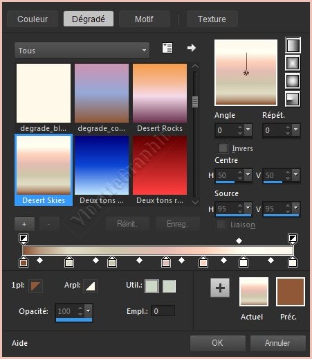 2 - Remplir de dégradé Desert Skies configuré ainsi: linéaire/angle= 0/ répétition = 0/ inverser non coché