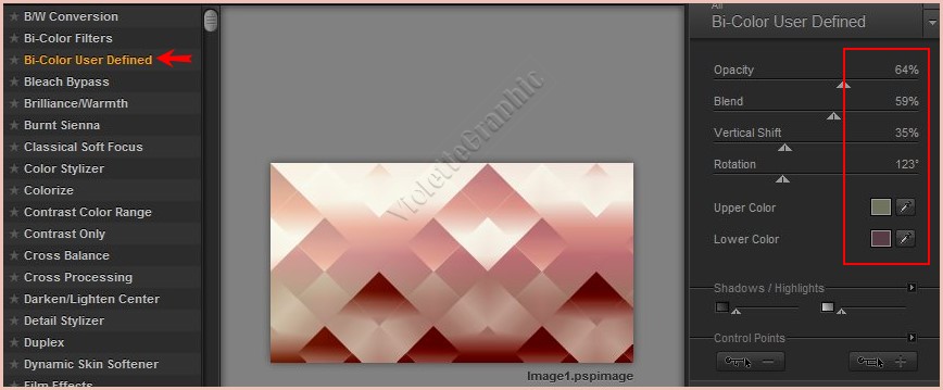11 - Activer le calque 1 **Effets/Nick Software /Color Effex Pro 3.0 Complete/ Bi-Colors Filters réglages suivants :