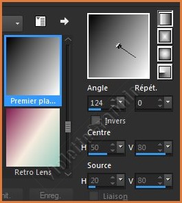 **Configurer un dégradé linéaire angle: 124°/Répétition: 0/Inverser non coché