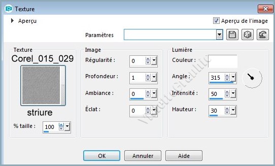 4 - Effets/Effets de Textures/Texture réglages suivants :