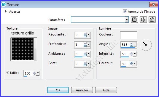 2 - Effets/Effets de Textures/Texture réglages suivants :