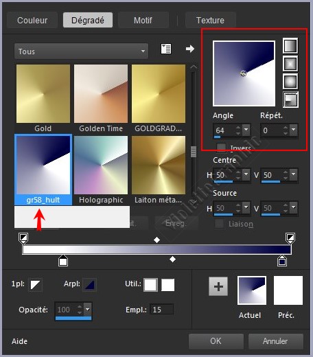 **Rechercher le dégradé gr58_huit radial angle: 64°/Répétition: 0/Inverser non coché