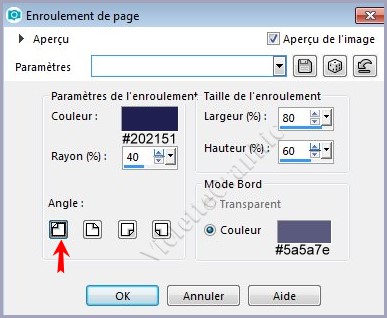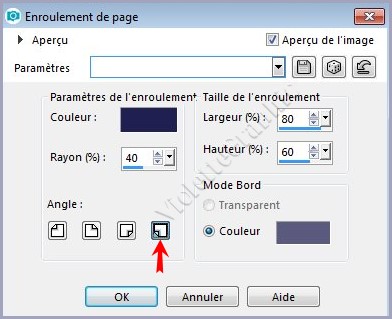**Effets/Effets d'image/Enroulement de page réglages suivants : 4ème coin