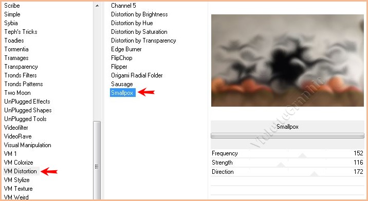 **Calques/Dupliquer **Image/Miroir/Miroir horizontal **Effets/Unlimited/VM Distorsion/Smallpox réglages précédents **Effets/Effets 3D/Ombre Portée : 4/0/100/1,45/couleur #000000