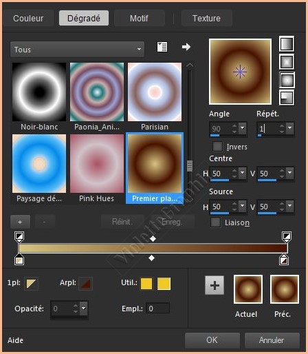 6 - Calques/Nouveau calque Remplir de dégradé halo angle: 0°/Répétition: 1/Inverser coché