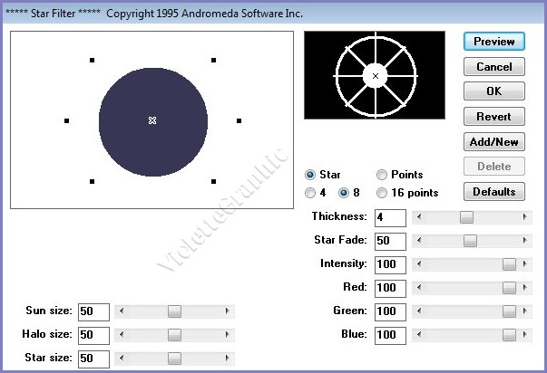 **Remplir de couleur premier-plan **Effets/Andromeda_Star Filter réglages suivants :