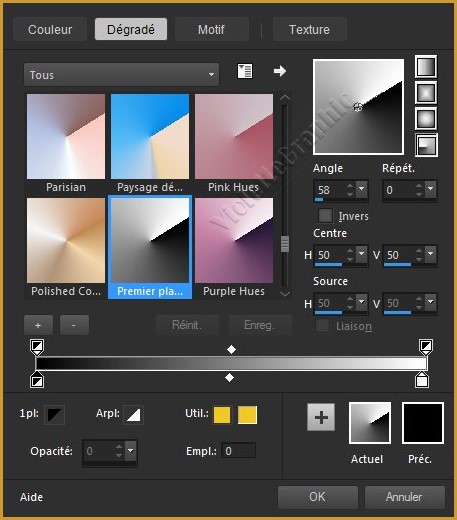 **Dans la Palette de Style Configurer un dégradé radial angle: 58°/Répétitions : 0/Inverser non coché