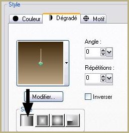 2 - Placer en avant-plan la couleur # bea886 et en arrière-plan la couleur #3f290dConfigurer un dégradé linéaire angle: 0°/Répétition: 0