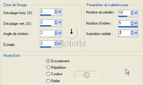 1 - Ouvrir l'image, la dupliquer et fermer l'original Placer la Police dans votre dossier Font 2 -Ouvrir l'image JAPA.jpg du zip 3 - Image /Ajouter des bordures : 30 pixels couleur #c1d5ee 4 - Avec la baguette magique sélectionner la bordure 5 - Effets / Effets de réflexion/Kaléidoscope :