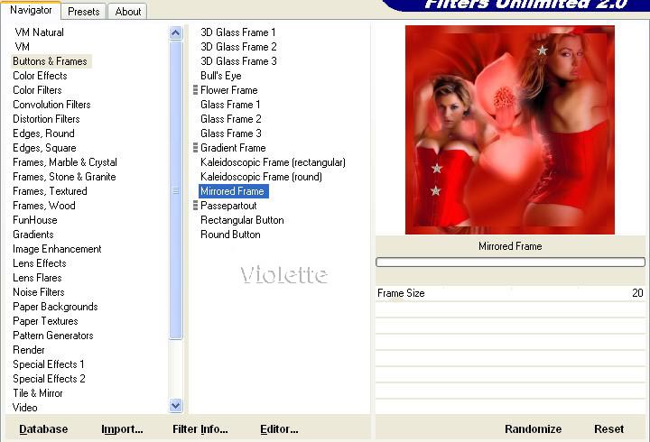 4 -Ouvrir une nouvelle image transparente de 570 x 570 pixels remplir de dégradé 5 - Réglages /Flou/Flou gaussien : 10 Faire 2 fois 6- Activez le tube "mistbyhs-74" Edition/Copier/Edition/Coller comme nouveau calque Image/Redimensionnez 2 fois à 85% le placer en bas à gauche 7 - Règlage/Netteté/Netteté 8 - Effets / Xero / Porcelain par defaut 9 - Vous ouvrez le tube "mistbyhs-73" Edition/Copier/Edition/Coller comme nouveau calque le placer à droite Règlage/Netteté/Netteté Réfaire une seconde fois 10- Effets / Xero / Porcelain par defaut 11 - Activer le tube "ametista_magnolia" Edition/Copier/Edition/Coller comme nouveau calque le placer au centre Opacité à 70% Mode du calque : Luminance héritée 12 - Effets/ Xero / Porcelain par défaut Calques /Agencer/ Déplacer vers le bas 13 - Activer le tube "Diamond Stars Accents" se placer sur le Raster 6 Edition/Copier/Edition/Coller comme nouveau calque Placer l'étoile sur les cheveux ( vois modèle) 14 - Calque/ Dupliquer placer l'étoile sur le corsage Calque/ Dupliquer placer la seconde étoile plus bas 15 - Calques /Fusionner les calques visibles 16 - Effets / Unlimited2.0 Buttons & Frames / Mirrored Frame