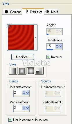 1 - Ouvrir l'image, la dupliquer et fermer l'original Placer la Police dans votre dossier Font 2 -Placer en avant-plan la couleur #a10906 et en arrière-plan la couleur #d2280e 3 - Configurer un dégradé halo répétitions 15 inverser coché