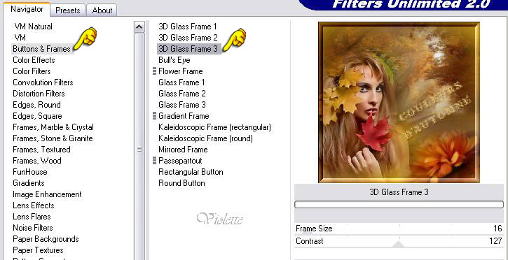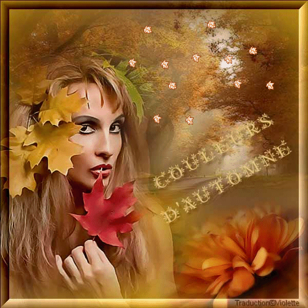 calque Le Placer dans la partie inférieure gauche 16 - Activer l'outil texte / Police GAYANE/ taille 30 Entrer le texte " Couleurs d'Automne"Sélectionner l'apostrophe et l'écrire avec une autre police 17 - Répéter l'ombre portée du n°8 18 - Calques / Fusionner tout 19 – Effets /Unlimited/Buttons and Frames / 3D Glass Frame 3 : 16/127