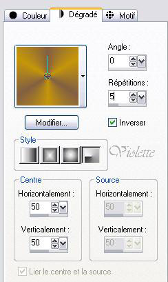 *** 1 - Ouvrir les tubes, les dupliquer et fermer les originaux 2 - Placer en avant-plan la couleur #c5960b et en arrière-plan la couleur #825f43 3- Configurer un dégradé radial angle : 0 répétition: 5 inverser coché