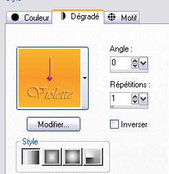*** 1 - Ouvrir les tubes (ouvrir les calques) , les dupliquer et fermer les originaux 2 - Placer en avant-plan la couleur #f9b42f et en arrière-plan la couleur #f69a2a 3- Configurer un dégradé linéaire angle : 0 répétition: 1 inverser non coché