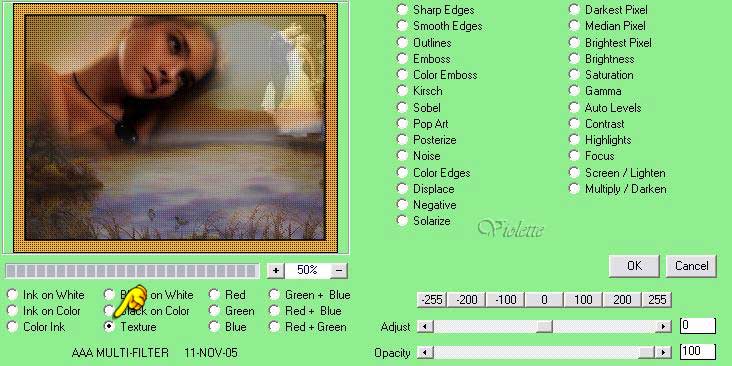 16 - Image/Ajouter des bordures : 3 pixels couleur noire 17 - Image/Ajouter des bordures : 20 pixels couleur blanche Sélectionner avec la baguette magique Effets/AAA Multi Filter/Texture :
