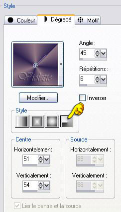 *** 1 - Ouvrir les tubes (ouvrir les calques) , les dupliquer et fermer les originaux 2 - Placer en avant-plan la couleur #2c204e et en arrière-plan la couleur #947885 Configurer un dégradé radial angle: 0°/ répétitions : 6 / inverser non coché