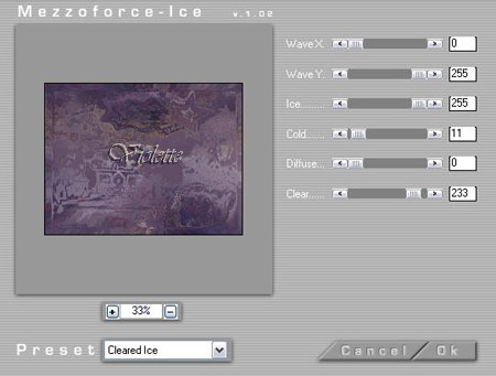 11 - Placer votre signature 12 - Image/Ajouter des bordures : 2 pixels / couleur #2c204e 13 - Image/Ajouter des bordures : 20 pixels / remplir de couleur contrastante Sélectionner avec la baguette magique Remplir de dégradé 14 - Effets/MezzoForce- Ice :