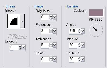 15 - Effets /Effets 3D/Ombre Portée : 2/2/50/10 Répéter avec des valeurs négatives : -2 en décalage vertical et horizontal 16 - Effets/Effets 3D/Biseautage Intérieur: