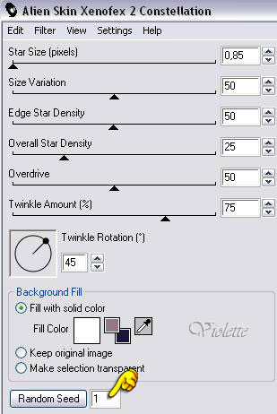 Désélectionner 17 - Image/Ajouter des bordures : 2 pixels / couleur #2c204e 18 - Avec l'outil lasso "point à point" sélectionner l'étoile et la queue Dupliquer deux fois Renommer les calques 1/2 et 3 19 - Fermer les calques 2 et 3 20 - Se placer sur le calque 1 Effets/ Alien Xenoflex 2/Constellation