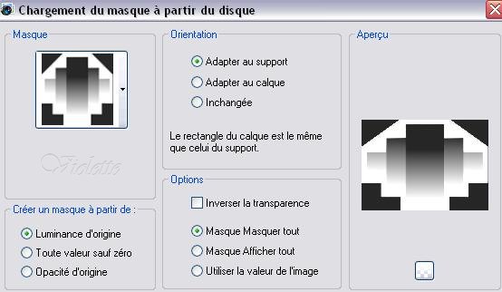 8 - Ouvrir une image transparente de 600 x 454 pixels/ Remplir de couleur blanche 9 - Edition/Coller comme nouveau calque 10 - Sélectionner les parties blanches avec la baguette magique Calques/Nouveau calque Remplir de couleur noire Appliquer le masque comme au n°3 Désélectionner