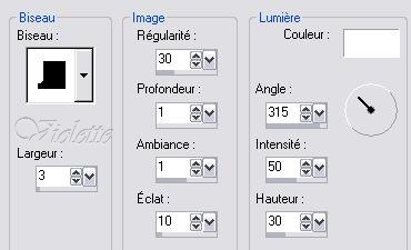 5 - Image/Ajouter des bordures : 2 pixels couleur blancheSélectionner avec la baguette magique Effets/Effets 3d/Biseautage Intérieur :