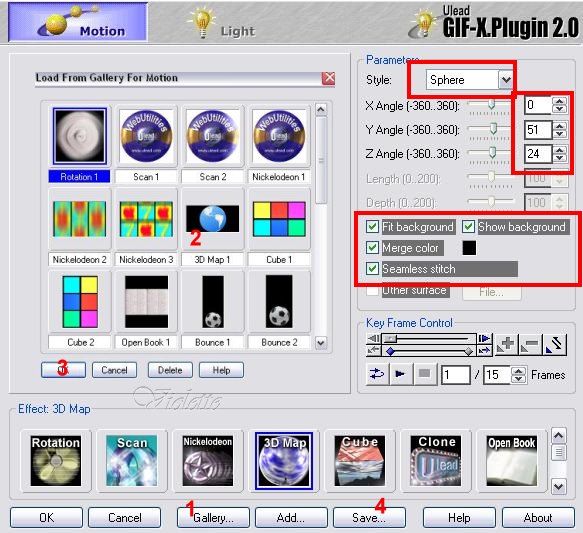 16 - Effets/ Ulead Effets/GIF-X 2.0 : clic sur "Gallery" / 3D Map 1/ OK