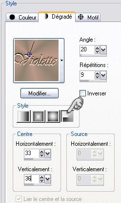 *** 1 - Ouvrir les tubes , les dupliquer et fermer les originaux Importer le pinceau 2 - Placer en avant-plan la couleur #bb9888 et en arrière-plan la couleur #8f803f Configurer un dégradé radial angle: 20/Répétitions: 9/Inverser non coché