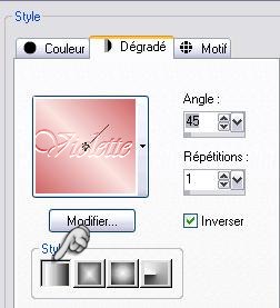 *** 1 - Ouvrir les tubes , les dupliquer et fermer les originaux Placer le masque dans le dossier correspondant 2 - Placer en avant-plan la couleur #fae2e0 et en arrière-plan la couleur #cf6567 Configurer un dégradé linéaire angle: 45°/Répétition: 1/Inverser coché