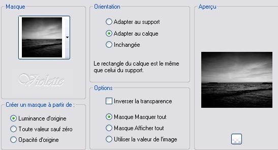 6 - Ouvrir le tube "Vela al tramonto" Calques/Charger/Enregistrer un masque/Charger à partir du disque/Choisir le masque 20/20 Calques/Supprimer/Calques/Fusionner le groupe Edition/Copier/Edition/Coller comme nouveau calque Image/Redimensionner à 120%/décocher " tous les calques" Placer comme ci-dessous: