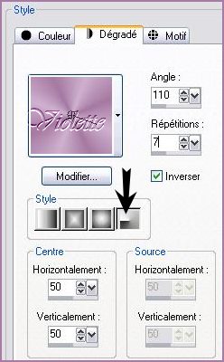 *** 1 - Ouvrir les tubes , les dupliquer et fermer les originaux 2 - Placer en avant-plan la couleur #a578a2 et en arrière-plan la couleur #ceb0ce Configurer un dégradé radial angle: 110°/Répétitions: 7/Inverser coché